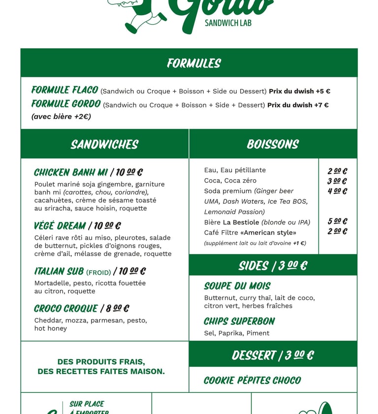 Gordo - le Sandwich Lab - vous accueille tous les midis en semaine avec des sandwichs gourmands faits maison inspirés de nos voyages, une sélection de boissons sympas - avec et sans alcool - et une bonne playlist pour déjeuner. Plus qu'une sandwicherie, Gordo c'est un laboratoire d’idées et de goût.